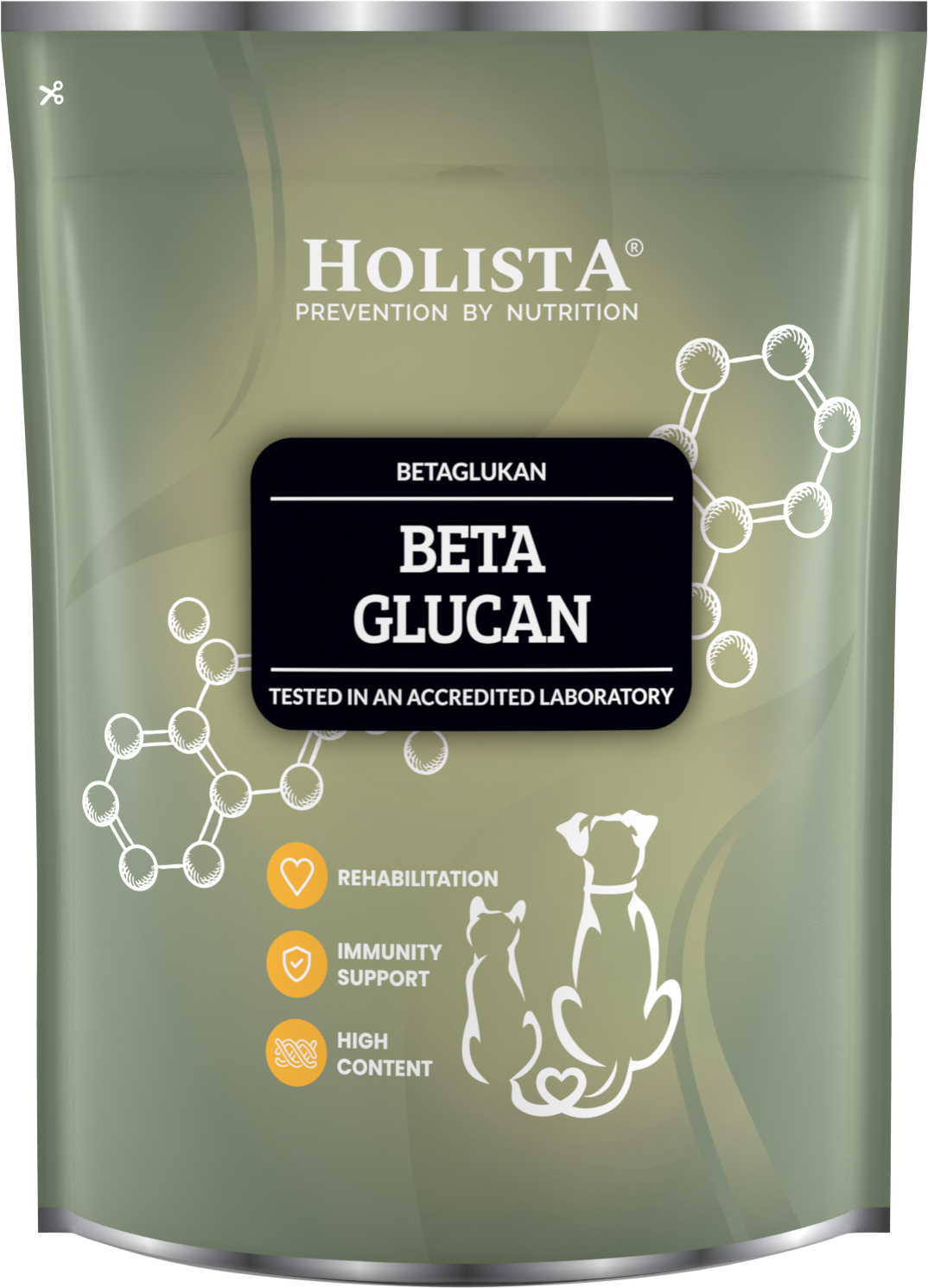 Complément alimentaire en poudre pour chiens et chats, contenant des β-glucanes de haute pureté, isolés des parois cellulaires de la levure Saccharomyces cerevisiae.