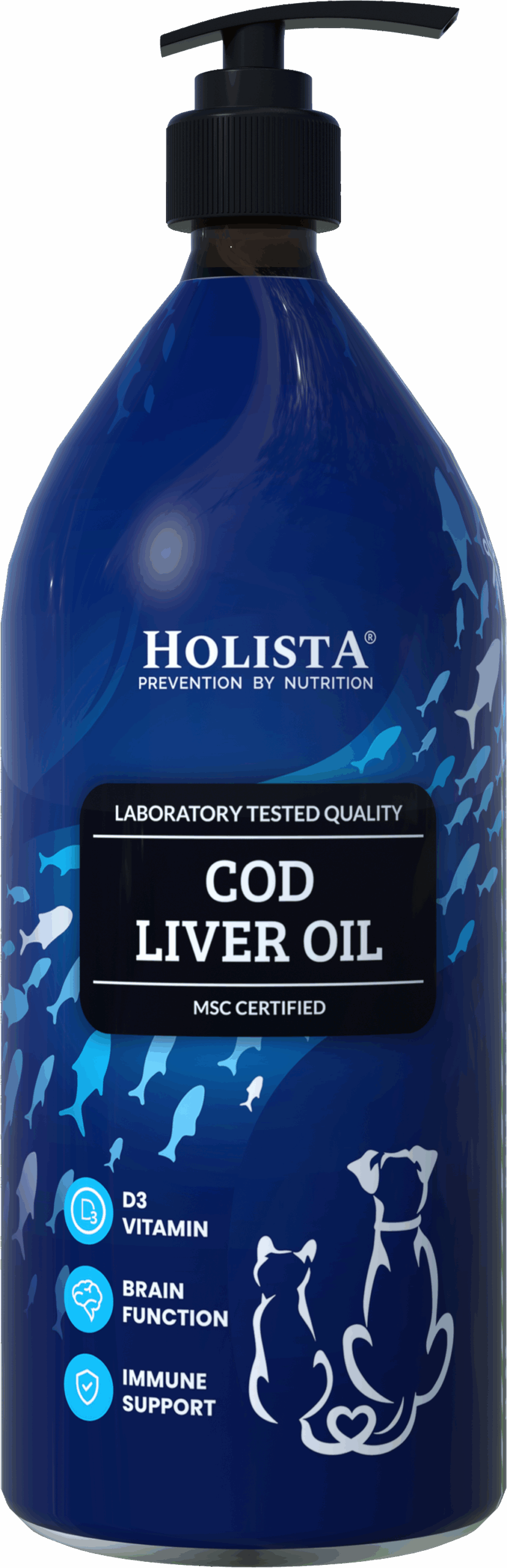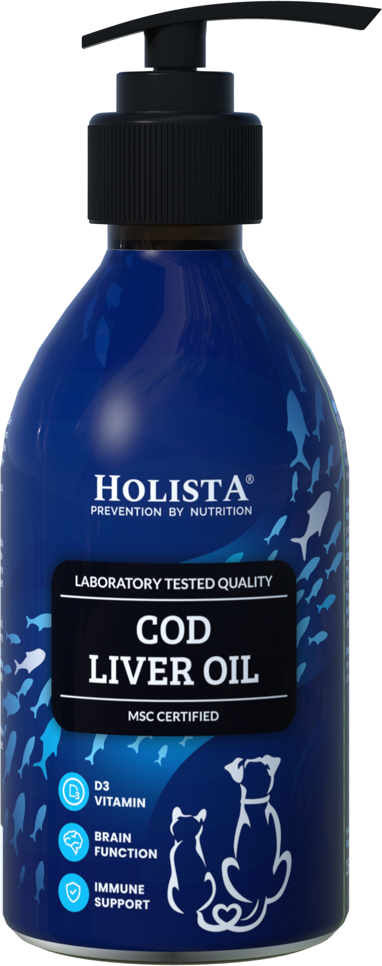 Holista Cod Liver Oil is made from fresh cod livers (Gadus morhua) caught in the pristine waters around Iceland. This product is free from genetically modified materials and ingredients and rich in EPA and DHA fatty acids, as well as vitamins A and D. Dogs and cats cannot naturally produce essential omega-3 fatty acids in their bodies, so it’s crucial to ensure our pets receive these fatty acids through high-quality supplements. Long-chain omega-3 fatty acids EPA and DHA support the health of the heart, kidneys, liver, joints, brain, and eyes.