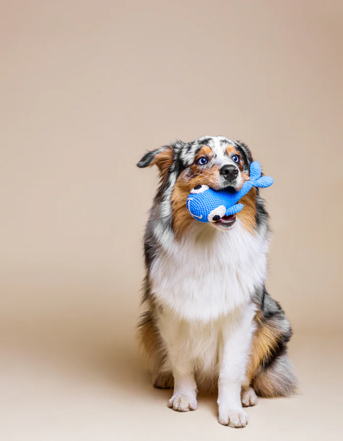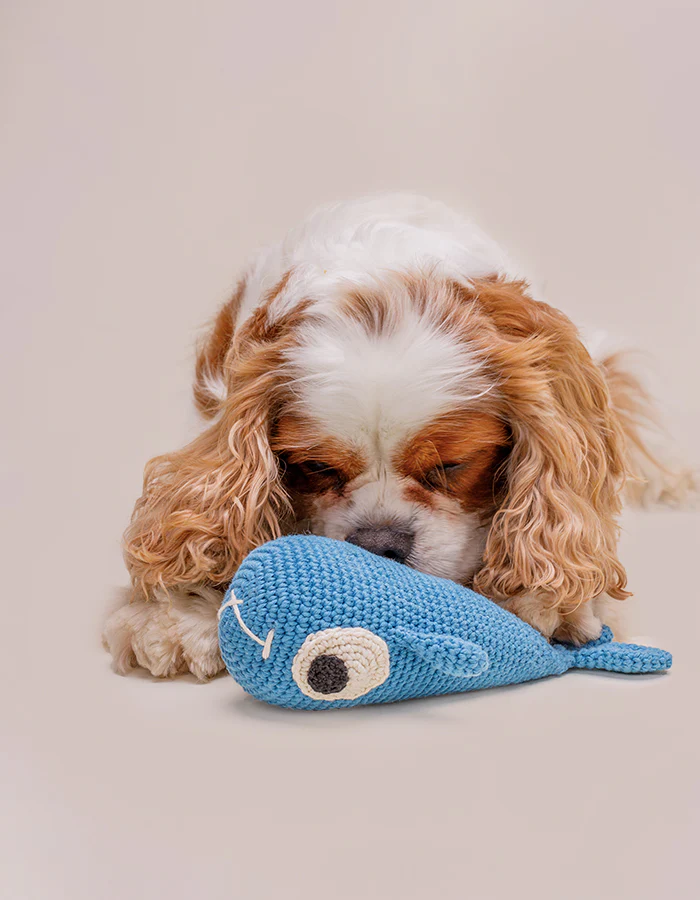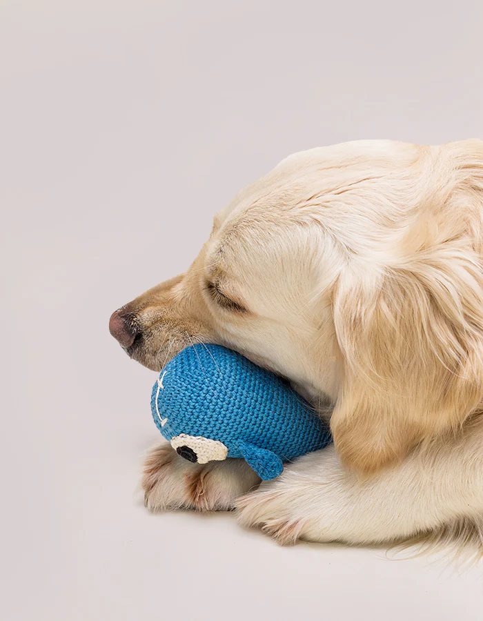 • Organic whale-shaped dog toy named Bazyl for hours of fun and play
