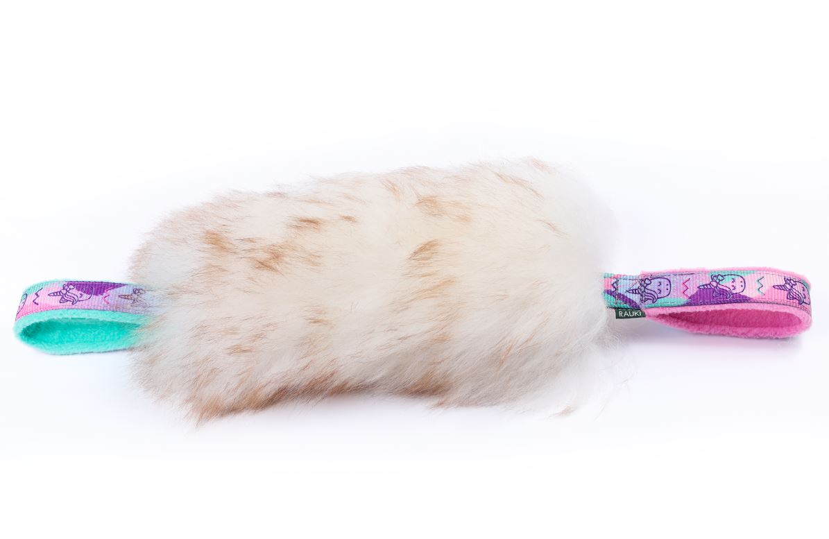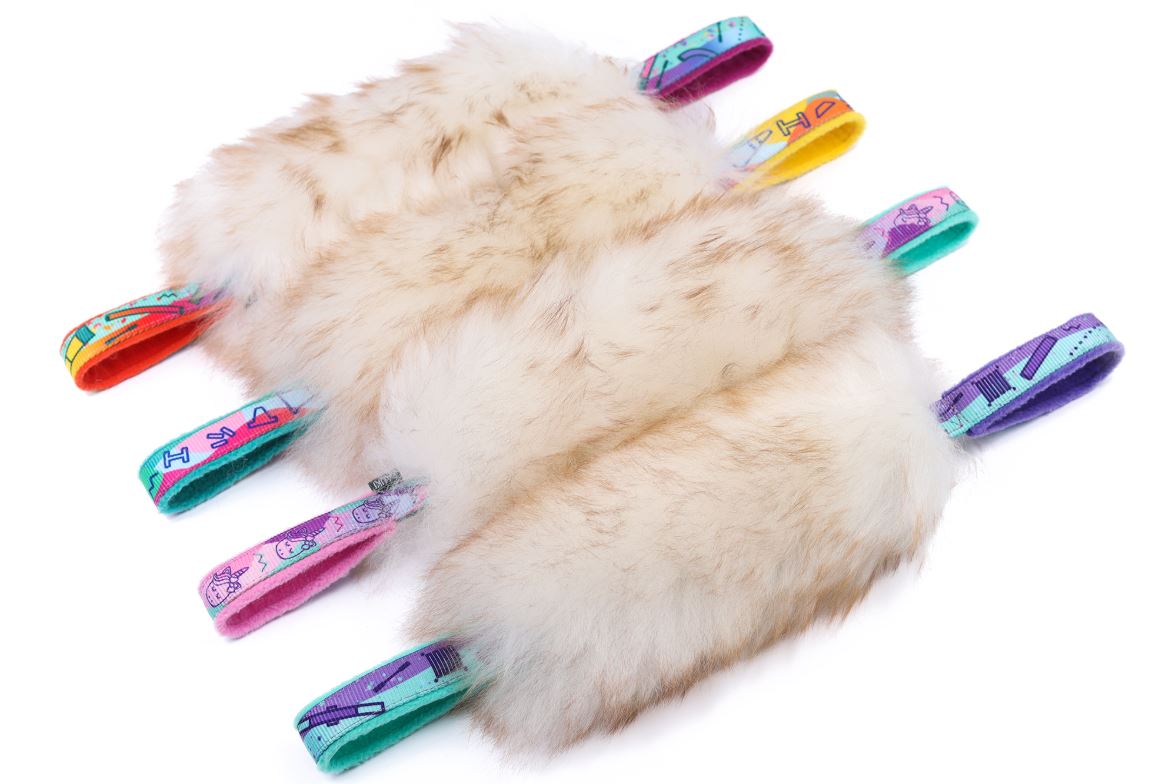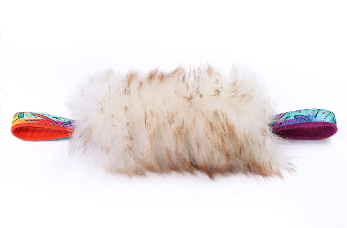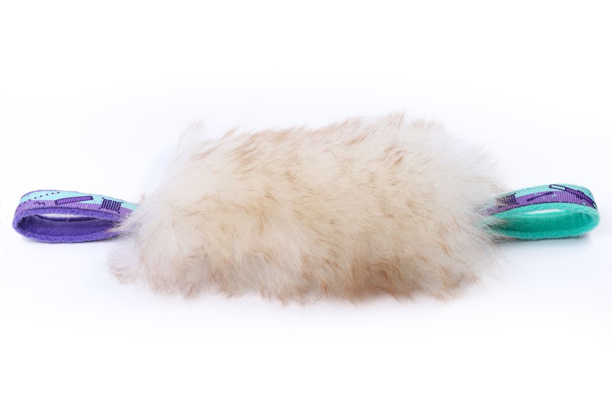 A tug toy made with natural sheep fur and two comfortable handles on each side, each in a different color.